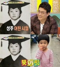 공개된 사진 속 김성주는 과거 어린시절 모습으로 아들 민율이와 완벽히 닮은 모습으로 시선을..