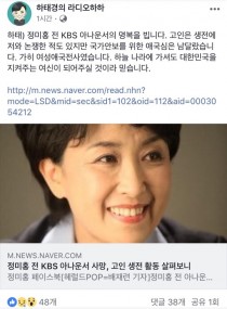 하태경 의원은 25일 자신의 페이스북에 "정미홍 전 KBS 아나운서의 명복을 빈다"고 말했다.