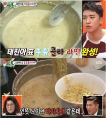 SBS '미운오리새끼에서 태진아가 자택에 놀러 온 후배들을 위해 우유콜라라면을 끓여 대접하는 장면이 방송됐다.