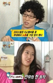 크리스탈은 과거 일 방송된 KBS2 '해피투게더3'에서 "'누예삐오'로 활동할 당시 옷을 위로 들었다 내리는 과감한 안무가 있었다"며 "그중 유독 내..