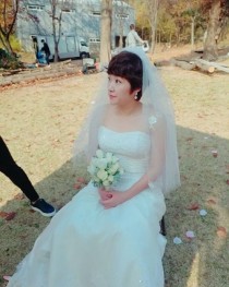 사진 속에는 순백의 웨딩드레스를 입은 김현숙이 의자에 앉아 어딘가..