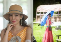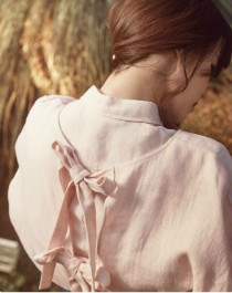 사진 속 구혜선은 베이지컬러의 리본 블라우스를 입고 긴 머리를 한쪽으로 쓸어내린채 고개를 숙이고 있다.