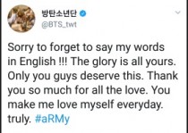 그룹 방탄소년단이 2일 2017 MAMA 올해의 가수상을 수상한 가운데, 공식 트위터를 통해 글로벌 팬들에게 감사의 마음을 전했다.방탄소년단은 2일 "Sorry to forget to say my words in English !!! The glory is all yo..