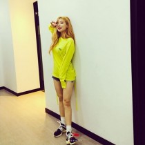 사진 속에는 화사한 노란색 티와 핫팬츠를 입고 카메라를 향해 포즈를..
