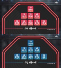JTBC '믹스나인'의 첫 순위가 공개되면서 치열한 경쟁을 예감케 하고 있다.19일 공개된 '믹스나인' 온라인 투표 순위 결과 여자는 신류진, 남자는 우진영이 1위를 차지했다.앞서 신류진은 소속사 평가에서 강렬한 표정연기와 춤 실력으로 눈길을 사로잡았다. 우진영은 Mn..