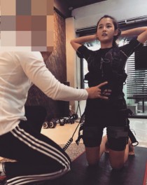 사진 속에는 남보라가 EMS 기구를 차고 열심히 운동하는 모..