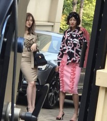 공개한 사진은 화려한 패턴의 블라우스와 핑크색 미디스커트 차림의 최여진과 짙은 베이지색 원피스 차림..