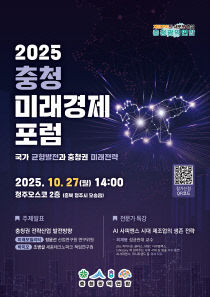 충청권의 미래 성장동력을 논의하는 '2025년 충청미래경제포럼'이 오는 27일 오후 2시 충북 청주시 오송읍 청주오스코에서 열린다. 이번 포럼은 지난해 12월 출범한 충청광역연합이 주최·주관하는 첫 대규모 경제행사로, 4개 시·도의 협력 네트워크를 강화하고 광역행정체제..