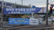 서산지역에서 추석 명절을 맞아 시내 주요 대로변은 물론, 주요 사거리, 공원 등 다중 이용 공간마다 다양한 인물들의 인사 현수막이 대거 내걸리며 시민들의 눈길을 끌고 있다. 내년 지방선거를 앞두고 기존 정치인들과 정치 신인들의 '얼굴 알리기' 움직임이 본격화됐다는 분석..