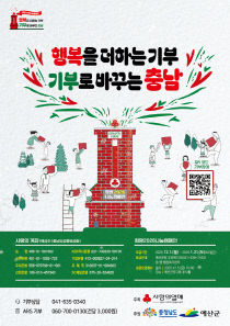 예산군은 12월 1일부터 내년 1월 31일까지 어려운 이웃에게 희망을 전하는 '희망 2026 나눔 캠페인'에 돌입한다고 24일 밝혔다. 예산군은 지난 7월 호우피해 지정기탁금 모금으로 인해 연말 기부 수요가 분산될 것으로 예상됨에 따라 올해 목표액은 작년보다 20% 감..