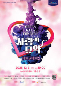 (재)논산문화관광재단(이사장 백성현)은 12월 3일 오후 7시 논산아트센터 대공연장에서 아트&아트인 ‘오페라 사랑의 묘약 갈라 콘서트’ 공연을 진행한다고 밝혔다. 논산아트센터 기획공연 ‘지역 예술인 우수 레퍼토리 지원사업’은 지역 문화예술단체 대상 공모를 통해 우수 프..