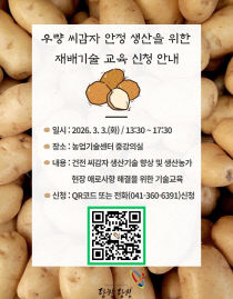 당진시(시장 오성환)는 3월 3일 오후 1시 30분 당진시농업기술센터 중강의실에서 씨감자 추백 재배 농가 및 교육 희망자 50여 명을 대상으로 '우량 씨감자 안정 생산을 위한 재배기술 교육'을 실시한다고 24일 밝혔다. 이번 교육은 건전한 씨감자 생산을 위한 재배 환경..