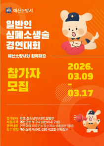 예산소방서(서장 김희규)는 오는 4월22일부터 23일까지 개최되는'2026년 일반인 심폐소생술 경연대회'에 참가할 팀을 모집한다고 6일 밝혔다. 이번 대회는 도민의 응급처치 역량을 강화하고 심정지 환자 발생 시 생존율을 높이는 한편, 대국민 생명존중 문화를 확산하기 위..