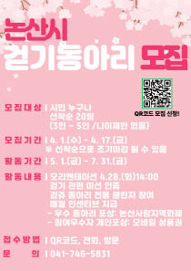 논산시(시장 백성현)가 시민들의 자발적인 건강 관리를 돕고 일상 속 걷기 문화를 확산시키기 위해 ‘비대면 걷기동아리’ 참여자를 모집한다고 밝혔다. 이번 사업은 시민들이 생활 속에서 스스로 건강을 실천할 수 있는 환경을 조성하기 위해 마련된 프로그램으로, 5월부터 7월까..