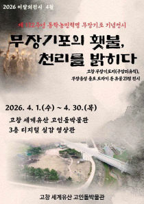 전북특별자치도 고창군이 제132주년을 맞는 동학농민혁명 무장기포를 기념해 세계유산 고인돌박물관에서 4월 한 달간 '무장기포의 횃불, 천리를 밝히다'를 주제로 전시 유물전을 연다. 군은 동학농민혁명의 역사적 가치와 의미를 조명하고 시대상과 생활상을 확인할 수 있도록 동학..