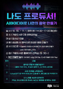 파주시 가람도서관은 10월, 청소년을 위한 창의적 음악 프로그램 '나도 프로듀서! 인공지능(AI) 아이디어로 나만의 음악 만들기'를 운영한다고 밝혔다. 이번 프로그램은 인공지능(AI)과 디지털 도구를 활용해 직접 음악을 제작하는 활동으로, 11월 1일까지 매주 토요일..