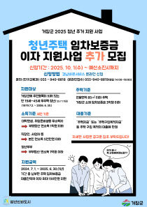 2025-10-09 거창군, 청년주택 임차보증금 이자 지원 접수 시작 경남 거창군이 청년 주거비 부담을 덜기 위해 '2025년 청년주택 임차보증금 이자 지원사업' 참여자를 10월 1일부터 예산 소진 시까지 수시 모집한다. 이번 사업은 민간 임차주택에 거주하며 금융기관에서 임차보증금 대출을 받은 청년에게 이자 일부를 지원해 안정적인 정주..