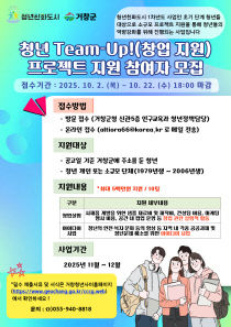 2025-10-09 거창군 청년 창업 지원 경남 거창군이 청년 Team-up 프로젝트 참여자를 오는 10월 22일까지 모집한다. 청년친화도시 1차년도 주요 사업으로 창의적 아이디어를 가진 초기 단계 청년들의 도전과 성장을 지원하는 것이 목적이다. 기존 창업·공동체 지원사업 참여가 어려운 청년들이 직접 기획하고..