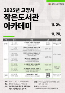 고양특례시는 관내 공·사립 작은도서관 운영자와 자원봉사자의 역량 강화를 위해 오는 11월 4일부터 20일까지 총 7회에 걸쳐 '2025년 작은도서관 아카데미'를 운영한다고 밝혔다. 이번 아카데미는 작은도서관 운영에 필요한 실무 능력을 체계적으로 높이기 위해 마련된 맞춤..