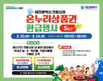 대전시는 10일부터 14일까지 총 5일 동안 설 연휴 소비 활성화와 지역경제를 살리기 위해 농림축산식품부, 해양수산부와 함께'전통시장 온누리상품권 환급행사'를 진행한다고 5일 밝혔다. 농림축산식품부 주관 환급행사 참여시장은 중앙활성화구역(역전시장 포함), 태평시장, 도..