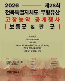 전북특별자치도 무형유산인 고창농악의 진수를 한자리에서 만날 수 있는 2026 제28회 전북특별자치도 무형유산 고창농악 공개행사가 오는 3월 1일 오전 10시부터 고창농악보존회 주관으로 고창농악전수관에서 열린다. 이번 공개행사는 정월 대보름을 맞아 군민과 관광객이 함께..