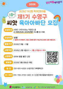 부산 수영구 육아종합지원센터가 아빠들의 적극적인 육아 참여를 독려하고 건강한 양육 문화를 조성하고자 '2026년 수영구 육아아빠단' 수강생을 모집한다. 수영구는 올해 6기째를 맞는 '새싹육아아빠단'과 영아기 자녀를 둔 아빠들을 위해 새롭게 출범하는 '씨앗육아아빠단' 두..