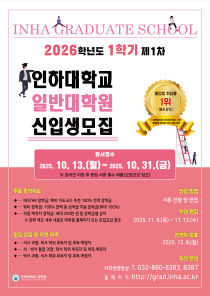인하대학교(총장 조명우)는 일반대학원이 오는 31일까지 미래 시대 혁신을 선도할 2026학년도 전기 신입생을 모집한다. 인하대는 공학, 자연과학, 인문사회, 예술체육, 의학 계열과 다양한 협동과정을 비롯한 70여개 학과에서 석사, 박사, 석·박사 통합과정 신입생을 뽑고..