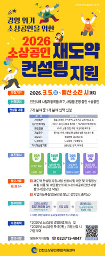 인천시는 5일부터 경영난을 겪는 지역 소상공인을 돕기 위해 맞춤형 현장 컨설팅을 제공하는 '소상공인 재도약 컨설팅 지원사업'을 본격 추진한다고 밝혔다. 이번 사업은 소상공인이 필요로 하는 분야를 직접 선택해 신청하는 수요자 맞춤형 방식으로 운영된다. 컨설팅 분야는 ▲경..