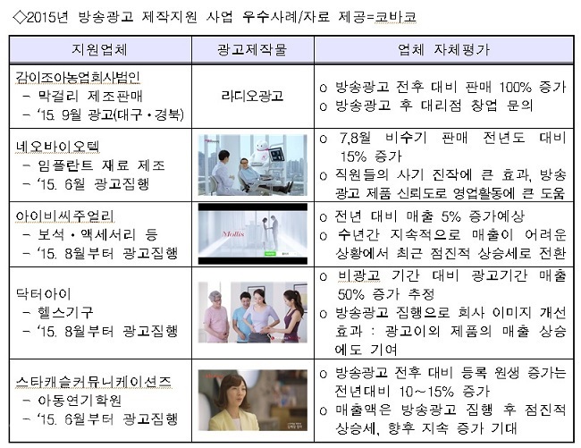 4일 코바코에 따르면 중소기업 방송광고 제작지원 사업은 재정적인 부담으로 방송광고를 하지 못하는 우수 중소기업에 대해 방송광고 제작비의 50%를 지원해 주는 사업이다. TV광고는 5,000만원, 라디오 광고는 400만원까지 지원해준다.