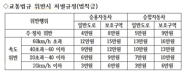 승용차의 경우 일반도로에서 제한 속도를 20km이하로 초과할 때는 범칙금 3만원이지만 보호구역에서는 6만원이 부과됩니다.
