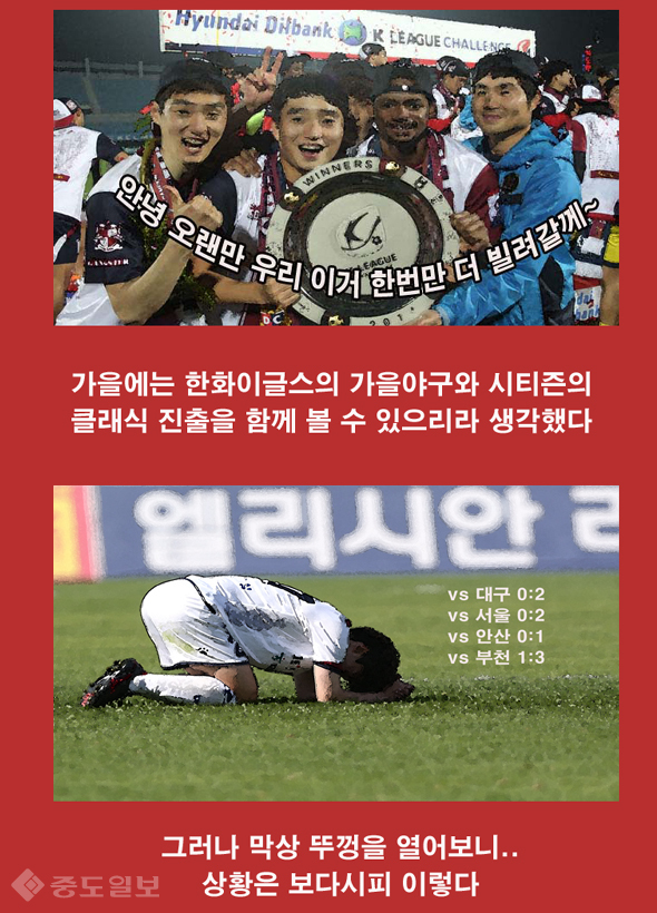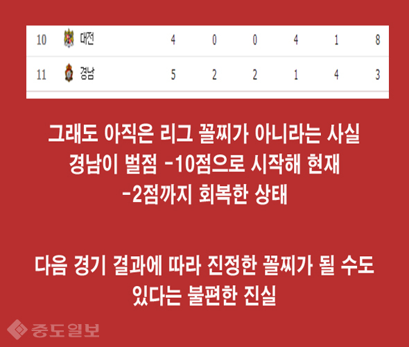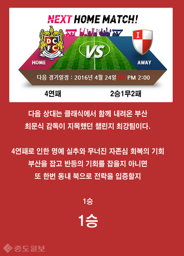 이번 주말 함께 강등됐던 부산과의 일전을 앞두고 있는데요 과연 대전 이번 홈경기를 승리로 이끌며 분위기 반전에 성공할 수 있을까요?