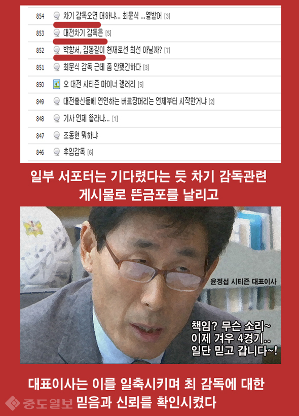 윤정섭 대표이사는 이에 대해 “사퇴는 없다. 아직은 시즌 초반이라 믿고 가겠다”며 최 감독에게 힘을 실어주고 있습니다.