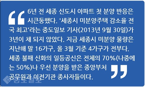 6년 전이었다. 세종 신도시 아파트 첫 분양 때의 반응은 시큰둥했다. 분양률 감소 자체가 주요 기사가 되곤 했다. '세종시 미분양주택 감소율 전국 최고'라는 중도일보 기사(2013년 9월 30일) 게재일이 3년이 채 되지 않았다. 지금 세종시 미분양 물량은 지난해 말 16가구, 올 3월 기준 4가구(국토교통부 집계)가 전부다. 세종 불패 신화의 일등공신은 전체의 70%(나중에는 50%)나 우선 분양을 받은 중앙부처 공무원과 이전기관 종사자들이다.