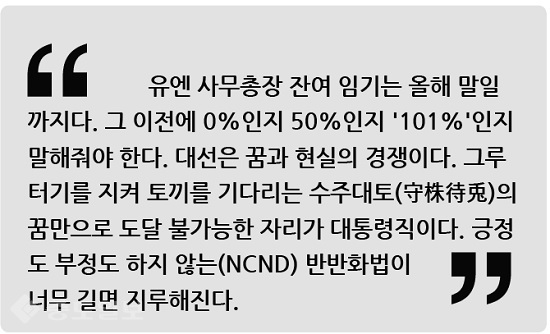 그 이전에 0%인지 50%인지 '101%'인지 말해줘야 한다. 되도록 유엔 비정부기구 콘퍼런스(경주), 제주포럼(제주), 로타리 국제회의(일산) 등의 기자회견 어느 단계에서 밝혀 여야 반반, 출마 가능성 반반인 '반반총장' 태그를 떼길 바라지만 가능성은 희박하다. 하지만 대선은 꿈과 현실의 경쟁이다. 그루터기를 지켜 토끼를 기다리는 수주대토(守株待兎)의 꿈만으로 도달 불가능한 자리가 대통령직이다. 긍정도 부정도 하지 않는(NCND) 반반화법이 너무 길면 지루해진다. 유엔 사무총장 임기가 중요한 것처럼 대선 시간표도 중요하다.