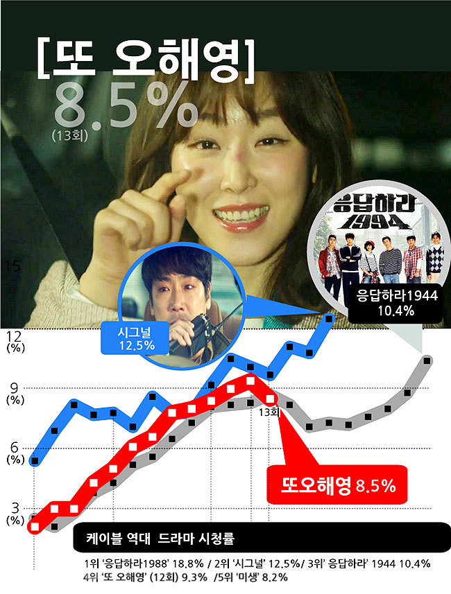 역대 케이블드라마 시청률 3위인 ‘응답하라 1994(10.4%)’와 1.9%포인트 차이로 벌어졌지만, 18회까지 연장 된 ‘또 오해영’이 종료까지 5회가 남은 상황에서 이대로의 인기라면 충분히 승산은 있어보인다.