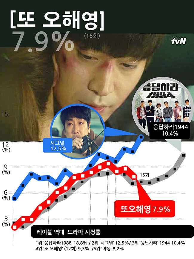 또 오해영은 12회에서 9.4%를 찍으며 10%대를 예상했지만 모두의 바램과는 달리 7회만에 다시 7%대로 떨어지고 말았다.