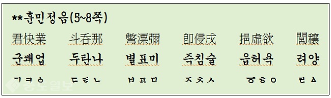 훈민정음 5~8쪽의 내용에 따르면 목, 화, 토, 금, 수, 오행의 상생순서로 군쾌업 세 글자는 목(木)이고, 두탄나 세 글자는 화(火)가 되고, 별표미 세 글자는 토(土), 즉침술 세 글자는 금(金)이며 읍허욕 세 글자는 수(水)이다.