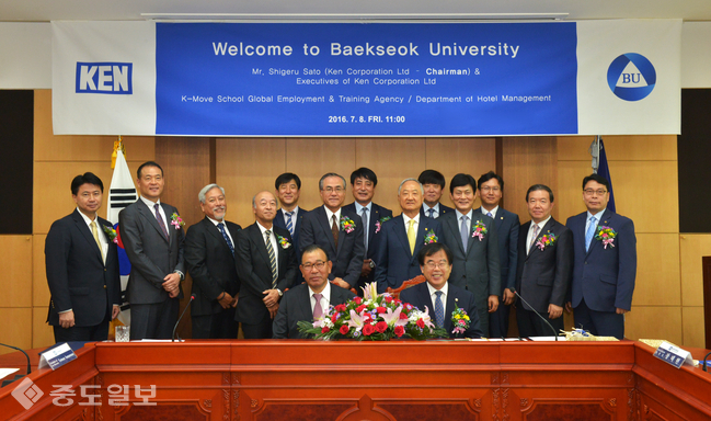 白石大学的于日本佳能公司签订了预约试人才教育,预计每年向日本输出40名海外就职人员。本月8号,白石大学于校内的小会议室中接待了佳能公司的会长,进行了“为适应公司需求的配对形人才培养协议签约式”。