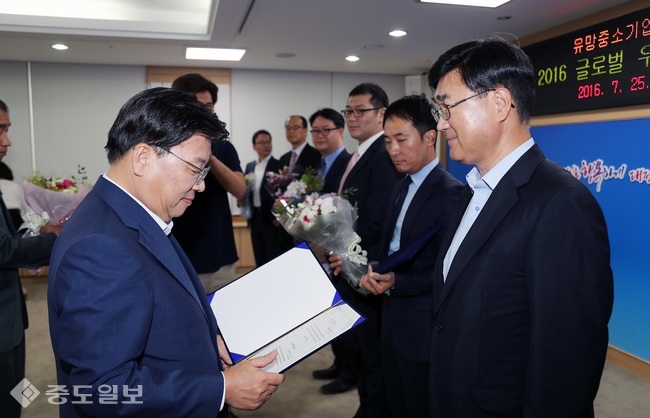 7月25日下午,在市政府会议室 ,为地区企业进军海外市场援助的6家企业颁发了‘全球优秀企业证书’。