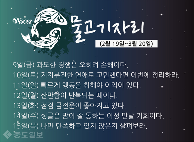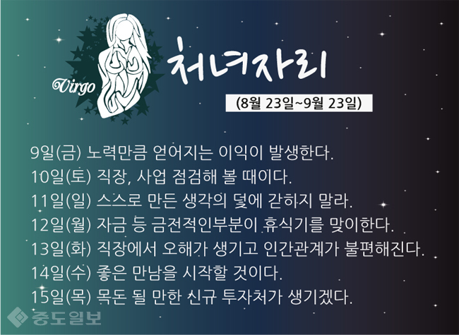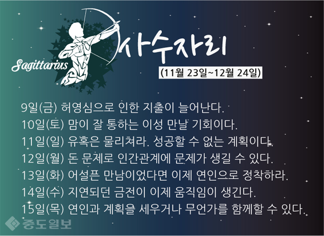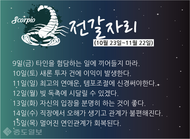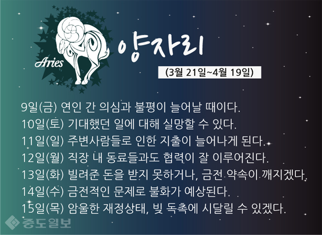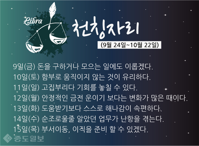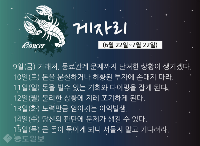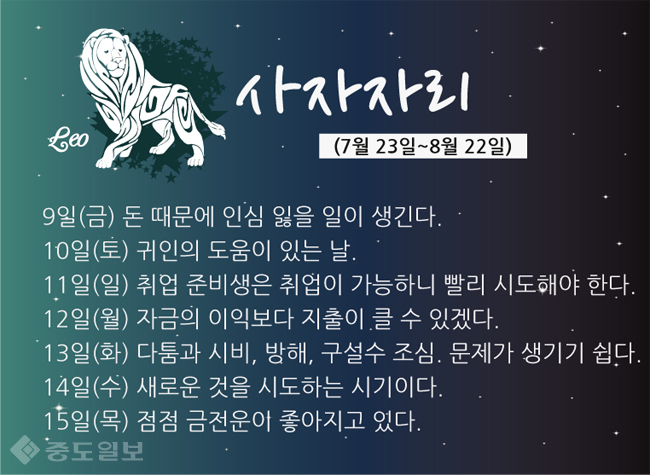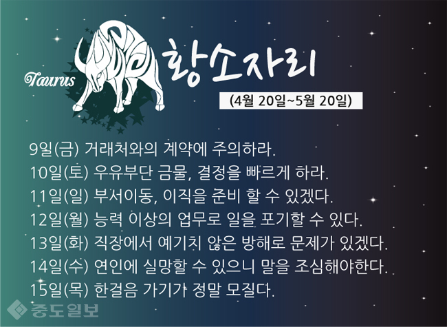 10일(토) 돈을 분실하거나 허황된 투자에 손대지 마라.