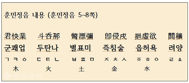 목, 화, 토, 금, 수, 오행의 상생순서로 군쾌업 세 글자는 목(木)이고, 두탄나 세 글자는 화(火)가 되고, 별표미 세 글자는 토(土), 즉침술 세 글자는 금(金)이며 읍허욕 세 글자는 수(水)이다. 려(閭) 는 반설음으로 반혓소리 이고, 양(穰) 은 반치음으로 반잇소린데 반설음 려(閭)는 설음에 배속하여 화(火)가 되고 반치음 양(穰)은 현재는 쓰지 않는다.