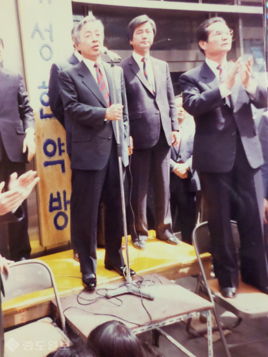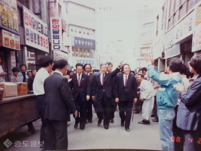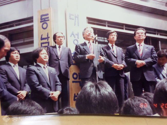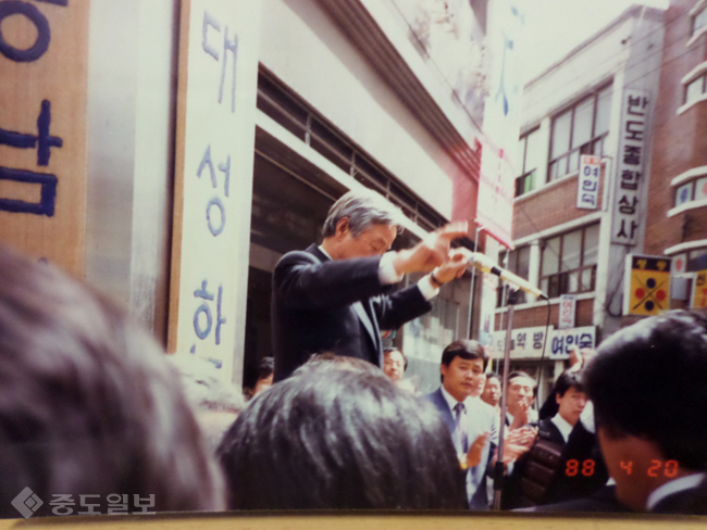 그러니까 당시는 그 신분이 ‘김영삼 대통령’이 아니라 ‘야당 총재’였던 시절이다. 장소는 대전시 동구 중동의 한약거리다. 어떤 한약방 앞에서 임시로 만들어진 연단 위에서 연설을 하는 장면이다.