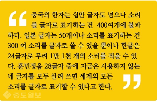 중국의 한자는 십만 글자도 넘으나 소리를 글자로 표기하는 건 400여개에 불과하다. 일본글자는 50 개이나 소리를 표기하는 건 300 여 소리를 글자로 쓸 수 있을 뿐이나 한글은 24글자로 무려 1만 1천개의 소리를 적을 수 있다.