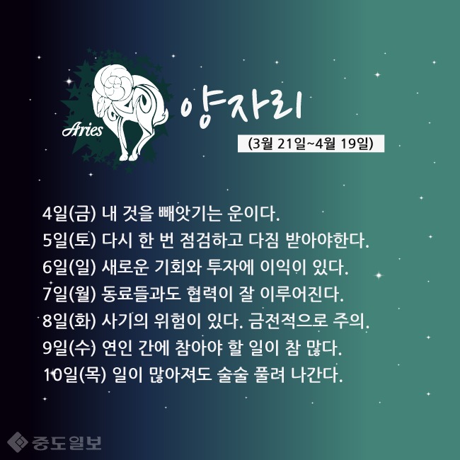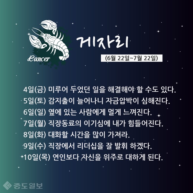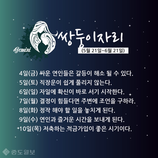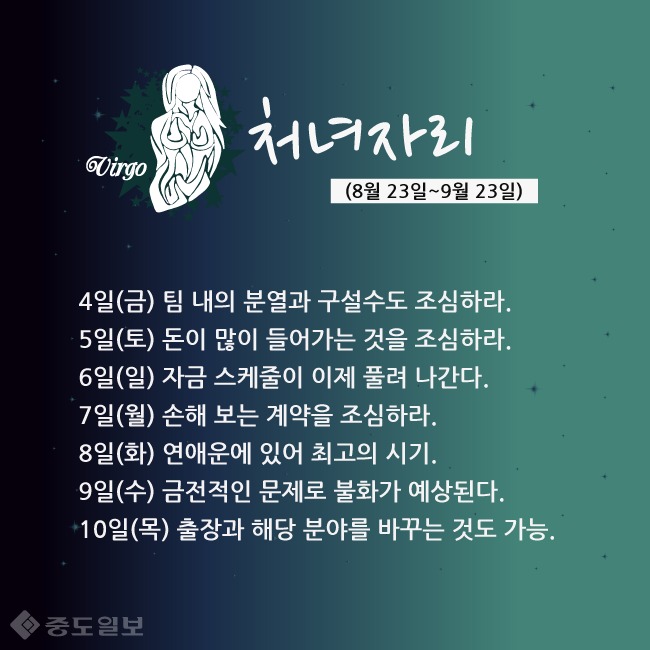 9일(수) 새로운 투자에 대해 신중하게 선택하라.