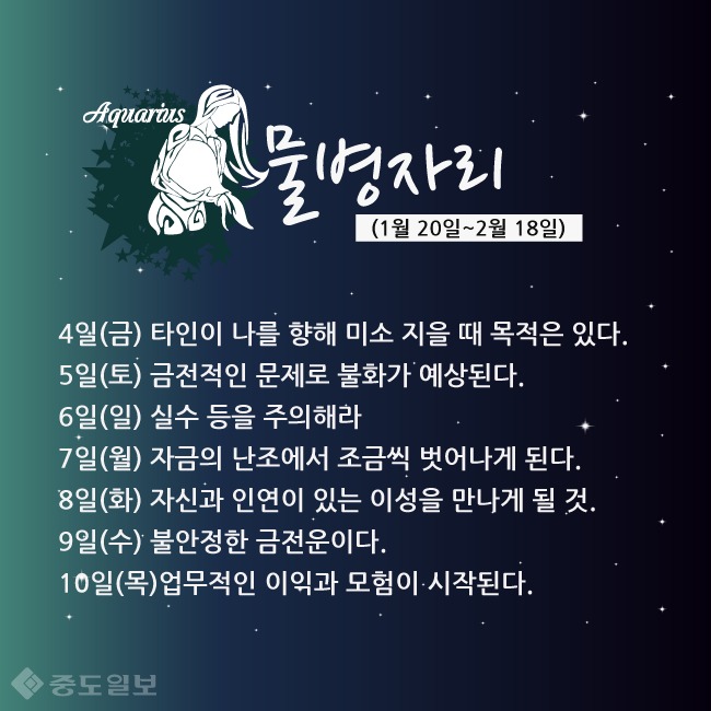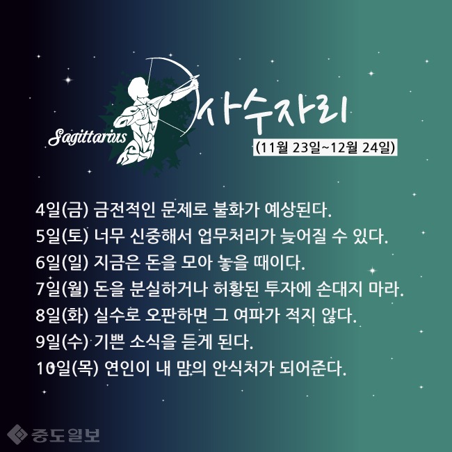 7일(월) 돈을 분실하거나 허황된 투자에 손대지 마라.
