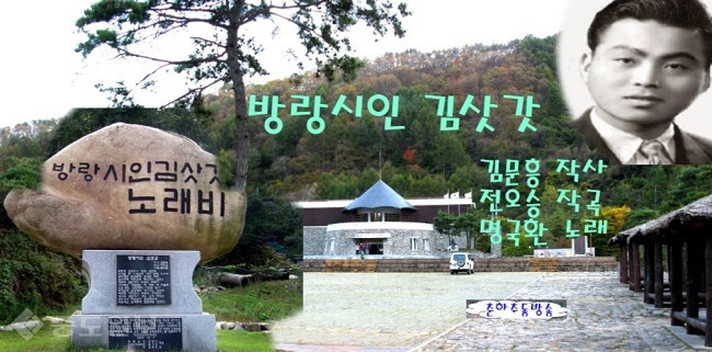 “죽장에 삿갓 쓰고 방랑 삼천리 흰 구름 뜬 고개 넘어 가는 객이 누구냐~ 열두 대문 문간방에 걸식을 하며 술 한 잔에 시 한 수로 떠나가는 김삿갓~ 세상이 싫던가요 벼슬도 버리고 기다리는 사람 없는 이 거리 저 마을로~ 손을 젓는 집집마다 소문을 놓고 푸대접에 껄껄대며 떠나가는 김삿갓~”
