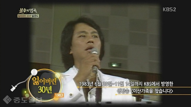 “비가 오나 눈이오나 바람이 부나 그리웠던 삼십 년 세월 ~ 의지할 곳 없는 이 몸 서러워하며 그 얼마나 울었던가요 ~ 우리 형제 이제라도 다시 만나서 못 다한 정 나누는데 ~ 어머님, 아버님, 그 어디에 계십니까 목 메이게 불러봅니다 ~”