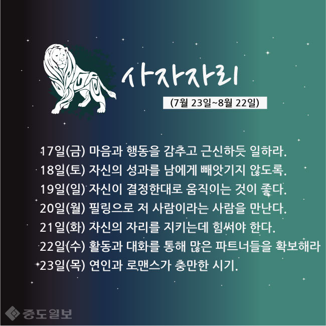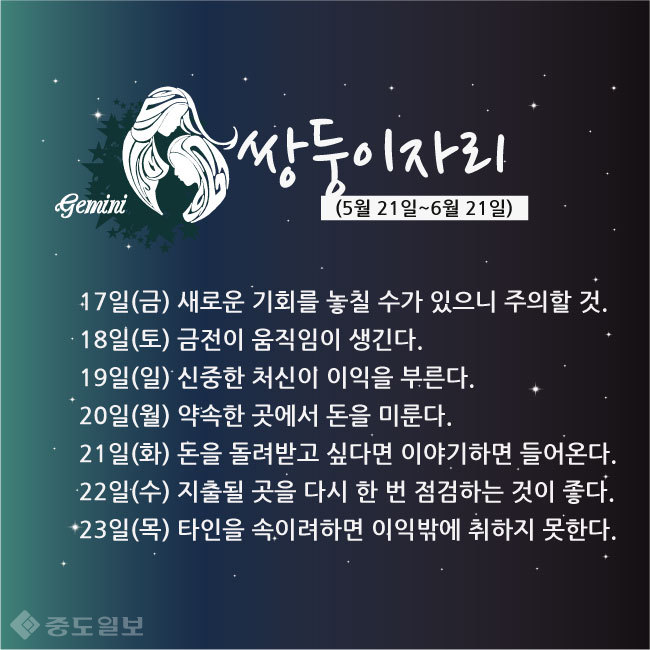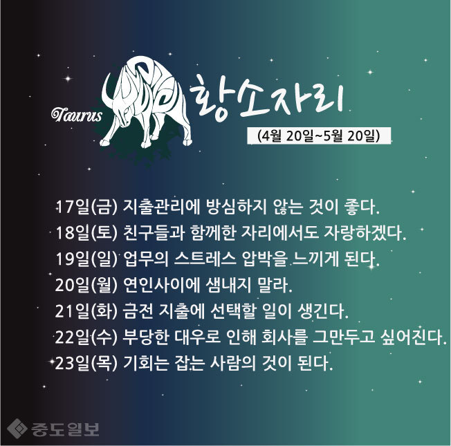 17일(금) 새로운 기회를 놓칠 수가 있으니 주의할 것.