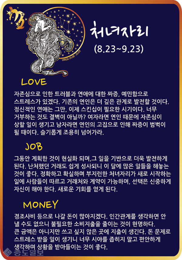 그동안 계획한 것이 현실화 되며,그 일을 기반으로 더욱 발전하게 된다. 난처했던 거래도 쉽게 성사되니 이 달에 많은 일들을 해놓는 것이 좋다. 정확하고 확실하며 부지런한 처녀자리가 새로 시작하는 일에 사람들이 따르고 거래처와 계약이 가능하며, 선택은 신중하게 자신이 해야 한다. 새로운 기회를 얻게 된다.