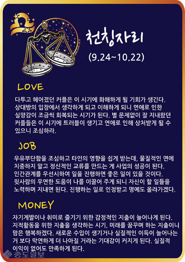 연인과의 모든 문제를 계산적으로 하려는 것을 버려야 한다. 당신에게는 공정해 보이지만 상대에게는 당신이 자신을 타인처럼 대하는 것으로 느껴진다. 일과 연애의 공정한 조율을 하며, 받은 만큼 연인에게 베풀어주고, 연인의 불평을 잘 조절하겠다.